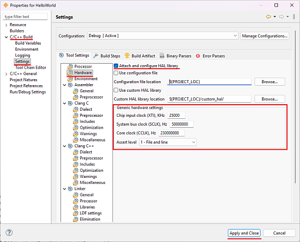 Библиотеки HAL можно добавить ссылкой на папку, в таком случае файлы библиотеки не будут находиться непосредственно в директории проекта, но при этом берутся из папки по пути установки среды CM-LYNX. Для этого в дереве проекта необходимо нажать ПКМ на названии проекта и выбрать пункт "Properties". В открывшемся окне следует перейти в C/C++ Build→Settings→Hardware и установить опцию Attach and configure HAL library. При этом настройки, которые приводятся в файле конфигурации 1967VN044_HAL_config.h, будут взяты из C/C++ Build→Settings→Hardware→Generic hardware settings (рисунок 9).
