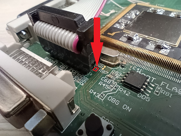 Первым делом необходимо вставить ключ в USB-порт и подключить программатор. Подключение программатора показано на рисунке 1: красный провод шлейфа - к выводу 1.