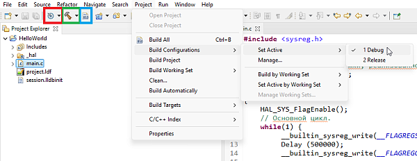 Чтобы посмотреть, как исполняется приведенная выше программа, нужно запустить проект в режиме отладки (debug). Но для начала необходимо выполнить компиляцию проекта. Перед рассмотрением режима отладки нужно убедиться, что выбран именно этот режим сборки. Это можно сделать, перейдя во вкладку Project→Build Configurations→Set Active→Debug. Также это можно проверить, нажав на стрелку у значка часов (выделен красным на рисунке 10) или, нажав на сам значок, и проверить, что режим Debug активен (выбран Active). Значок молотка (выделен зеленым на рисунке 10) выполняет компиляцию. Нажав на стрелку рядом, можно выбрать, что будет выполняться именно компиляция. Значок документа (выделен синим на рисунке 10) скомпилирует все конфигурации (Ctrl+B).