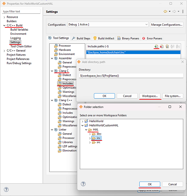 После добавления файлов HAL в проект для тулчейна необходимо указать пути к заголовочным файлам. В дереве проекта необходимо нажать ПКМ на названии проекта и выбрать пункт "Properties". В открывшемся окне следует перейти в C/C++ Build→Settings→Clang C→Includes и в поле "Include paths" нажать на кнопку "Add" (значок "плюсика"), как показано на рисунке 8. Далее добавить пути HAL и HAL/inc. В результате компилятор C тулчейна при сборке данной конфигурации будет искать заголовочные файлы по этим папкам. В случае, если HAL добавлен при создании проекта, папка HAL называется custom_hal и путь custom_hal/inc уже добавлен, нужно добавить только путь к custom_hal. В случае, если HAL добавлен через настройки, папка с HAL называется в соответствии с указанными при добавлении настройками.