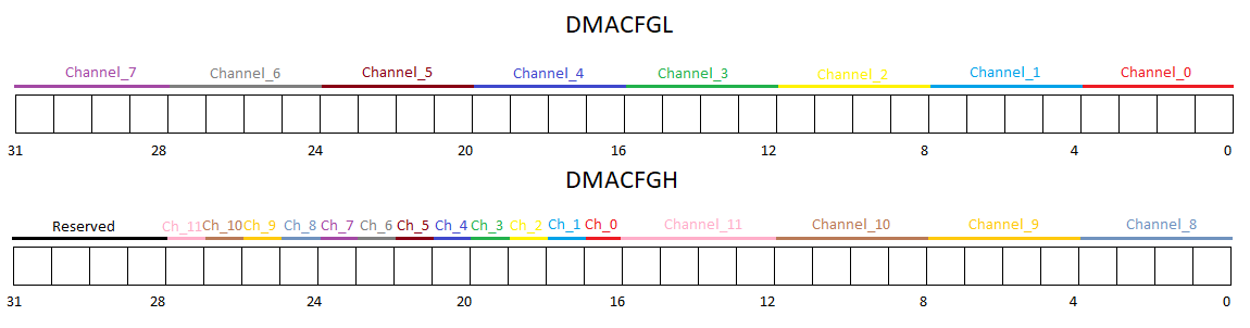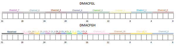 В процессоре К1967ВН044 конкретному каналу DMA на приём/передачу указывается источник запроса. Для этого введены два специальных регистра DMACFGL и DMACFGH (таблица 1).