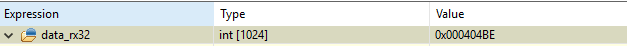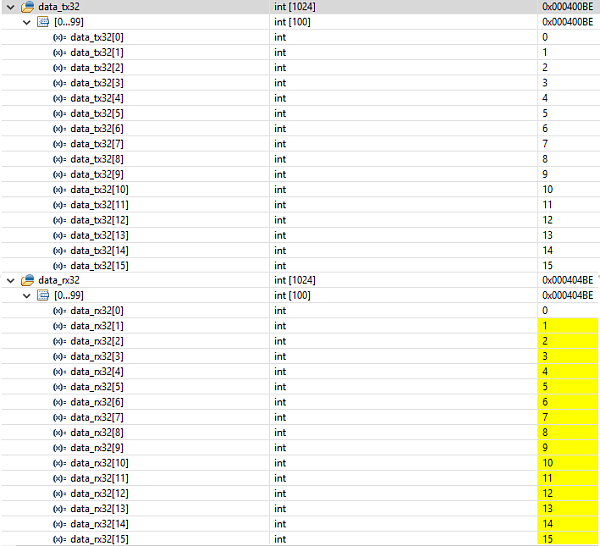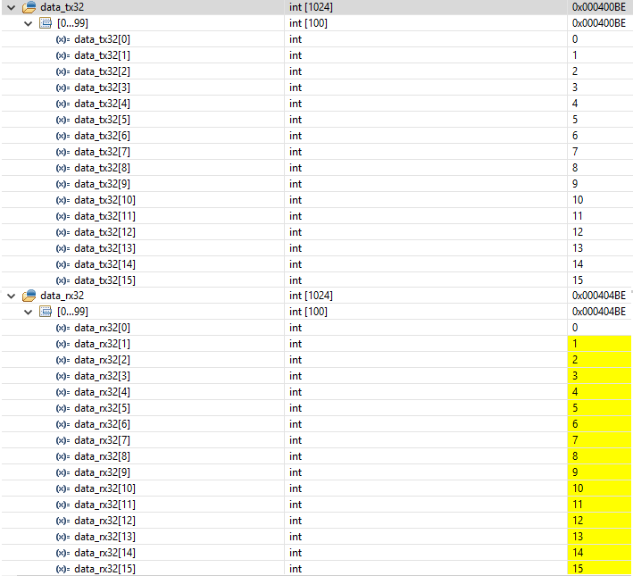 Это говорит о том, что используемый второй канал DMA отработал, и старшее поле TY регистра DP приняло значение 000, что соответствует выключенному каналу. И теперь можно увидеть, как DMA перенес данные из массива data_tx32 в массив data_rx32.