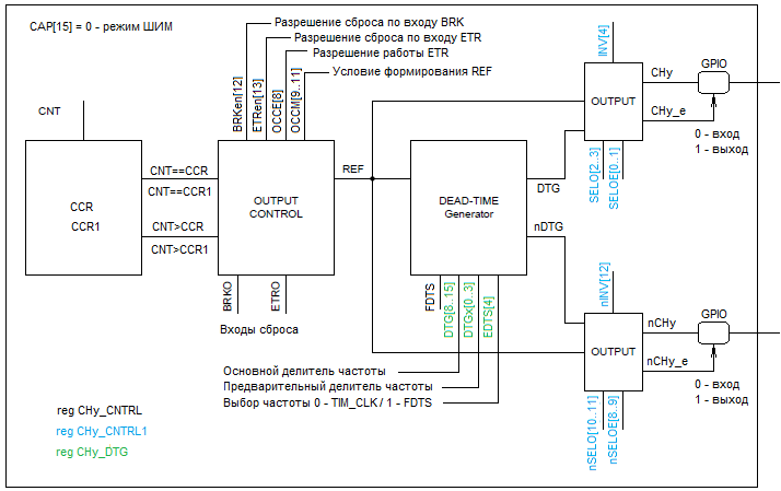 За подачу сигналов на прямой и инверсный выводы отвечает регистр CHy_CNTRL1, здесь для каждого из выводов своя настройка. Поле SELO[1:0] определяет, какой сигнал подается на выход.