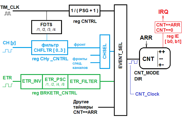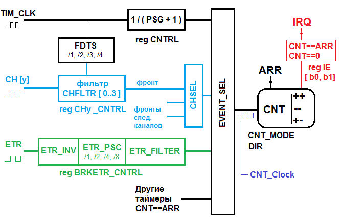 Каждый таймер имеет отдельный внешний вывод ETR, который всегда используется как вход. Фронт или спад (в зависимости от выставленного бита ETR_INV регистра BRKETR_CNTRL - по умолчанию ETR_INV = 0 (счёт CNT по фронту)) сигнала на данном выводе могут также быть источником изменения CNT. Вход ETR необходим, чтобы оставить каналам таймера их основную функциональность - работу в режимах ШИМ (Широтно-Импульсной Модуляции) и захвата, при этом счет будет происходить по сигналу с ETR.