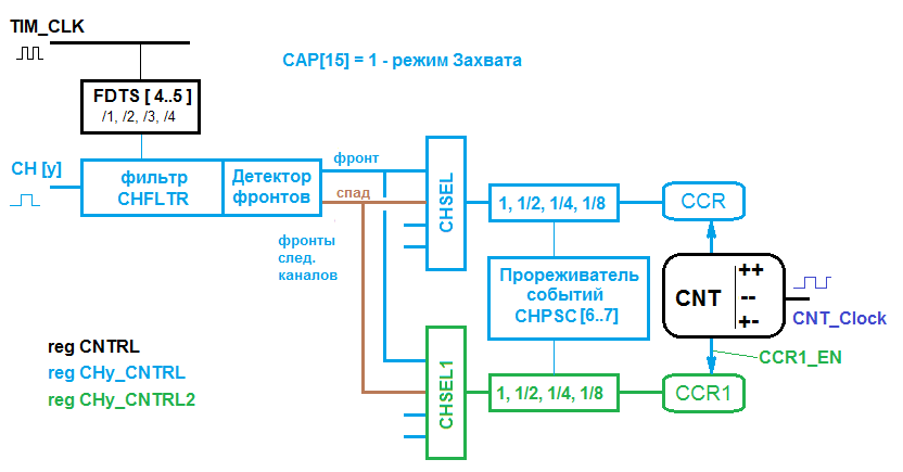 В регистре CHy_CNTRL в поле CHSEL[1:0] задается по какому событию CNT будет сохраняться в CCR, по фронту или по спаду. Аналогичный выбора события для CCR1 осуществляется в регистре CHy_CNTRL2 поле CHSEL1[1:0].