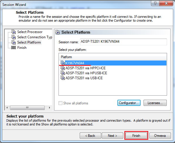 Выбираем платформу K1967VN044 и нажимаем «Finish» (рисунок 14).
