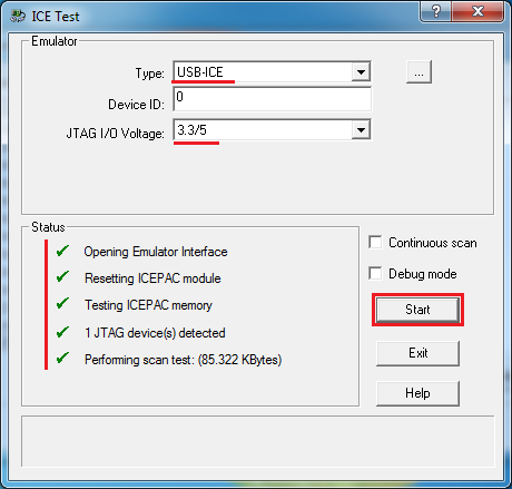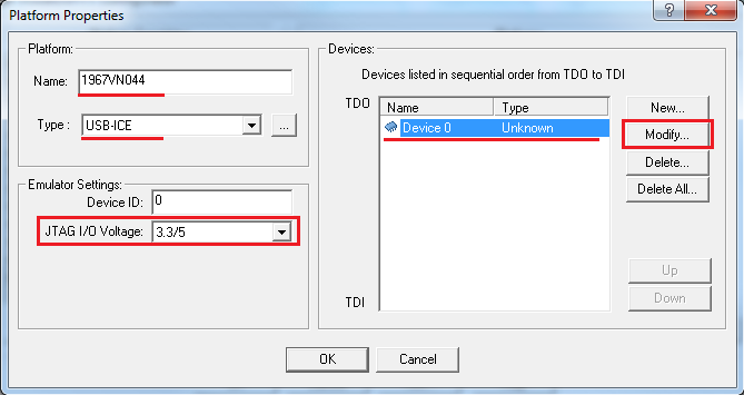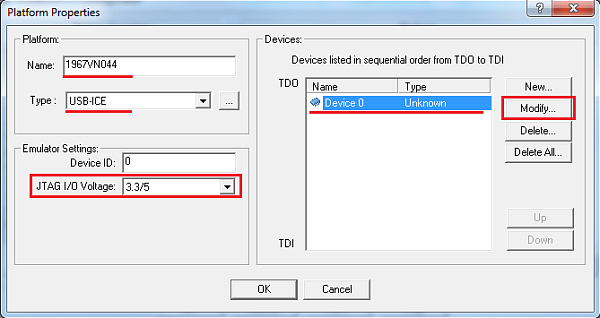Далее заполняем поля слева, как показано на рисунке 5, выбираем «Device 0» и нажимаем кнопку «Modify…». Обязательно выбираем программатор "USB-ICE" и напряжение 3.3/5 В, поле Device ID определяется автоматически.