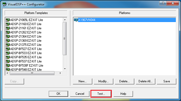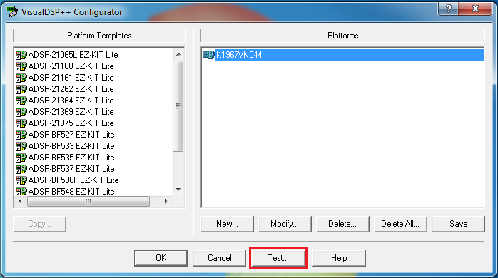 В окне "Configurator" выбираем ранее созданную платформу K1967VN044 и нажимаем кнопку "Test" (рисунок 9).
