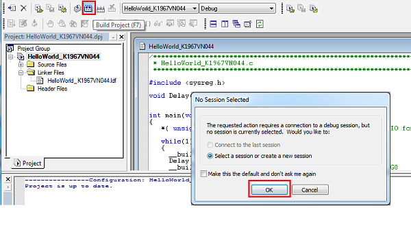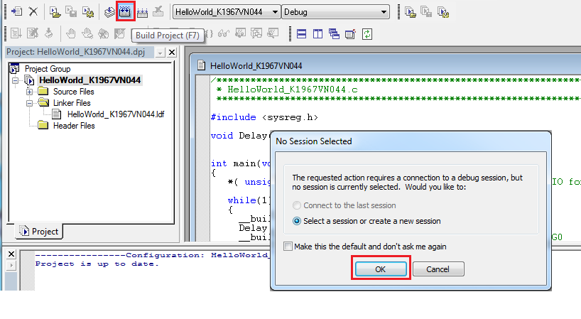 Теперь запускаем VDSP++, собираем проект и в появившемся окне «No Session Selected» нажимаем «OK», как показано на рисунке 11.