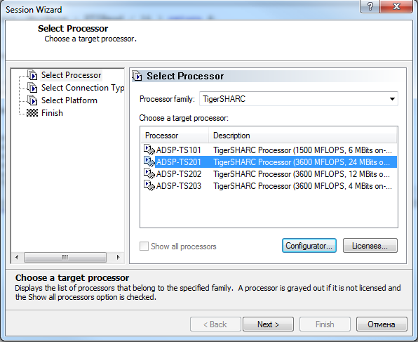 Рисунок 12 - Настройка сессии отладки: Session Wizard -> Select Processor