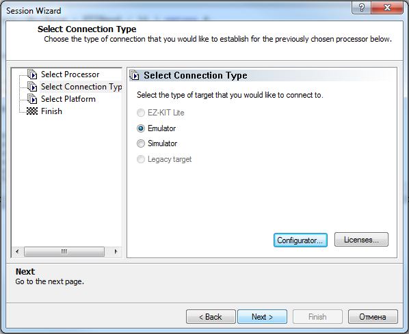 Рисунок 13 - Настройка сессии отладки: Session Wizard -> Select Сonnection Type