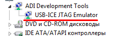 На ПК проверяем в трее, определилось ли устройство. Если нет, то переходим в диспетчер устройств, находим используемый программатор как неопознанное устройство, в свойствах выбираем обновить драйвера, где указываем папку «C:\Analog Devices\VisualDSP 5.0\Setup». Проверяем в диспетчере устройств, что эмулятор определяется, как показано на рисунке 2.