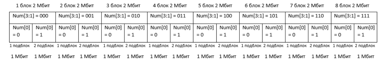 Важным аспектом при реализации драйвера стоит отметить разметку памяти в зависимости от битов Num[3:0] (активный уровень "1") в командной последовательности. Для более глубокого понимания раскладка памяти представлена на рисунке 3: