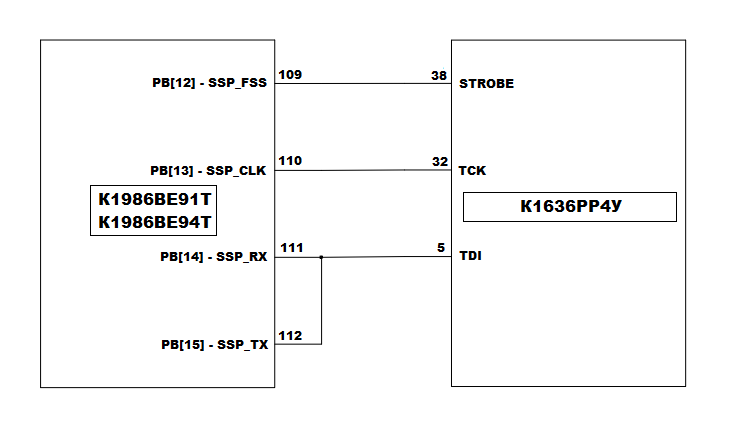 Для организации взаимодействия по данному последовательному интерфейсу со стороны внешнего устройства удобно использовать интерфейс SPI в режиме с SPO = 1 и SPH = 1, который будет учитывать специфику внутреннего протокола, в рамках которого, например, потребуется самостоятельно управлять выводом STROBE (на стороне внешнего устройства это линия SSP_FSS).