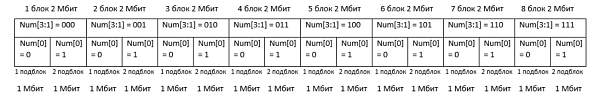 Из рисунка 3 следует, что если стоит задача обратиться, например, ко второму подблоку шестого блока памяти (всего их восемь, каждый блок объемом по 2 Мбит: блок при этом делится на два подблока, то есть каждый подблок объемом по 1 Мбит), необходимо при организации командной последовательности задать значение Num[3:0] равное 0b1011.